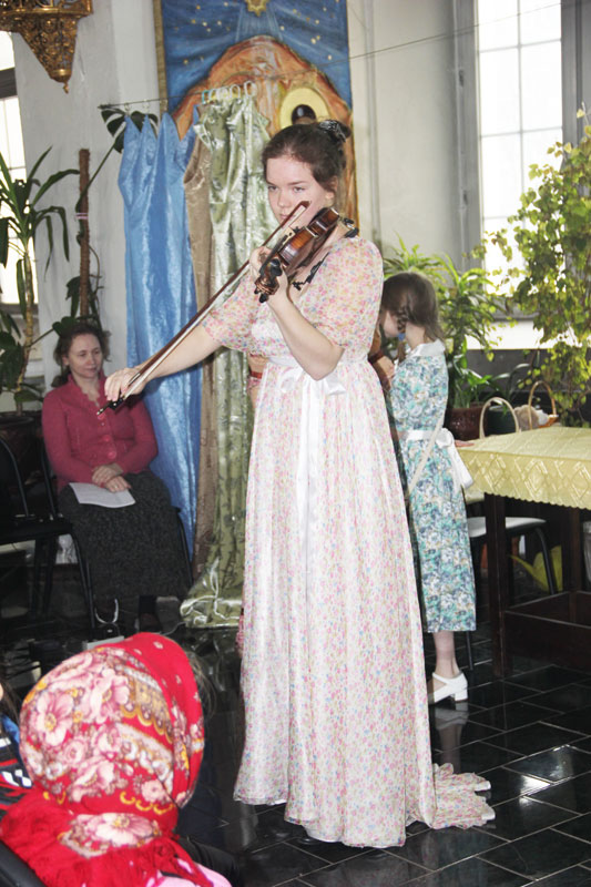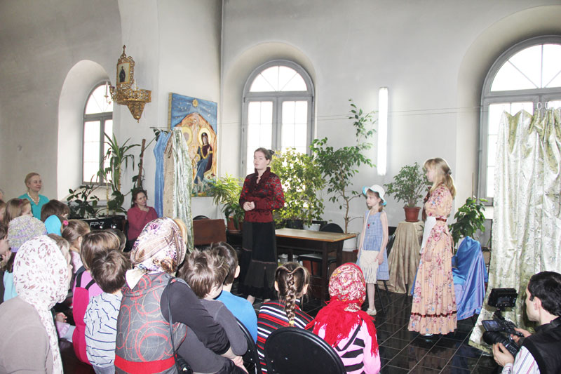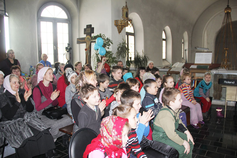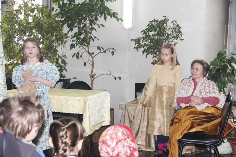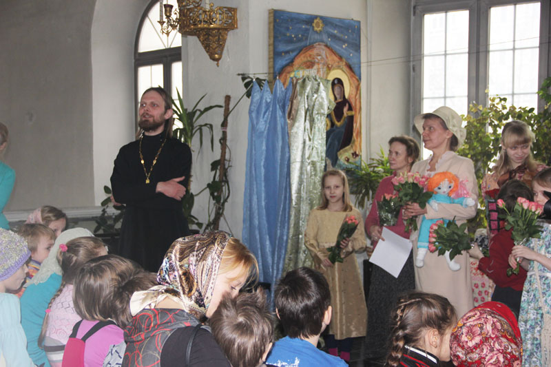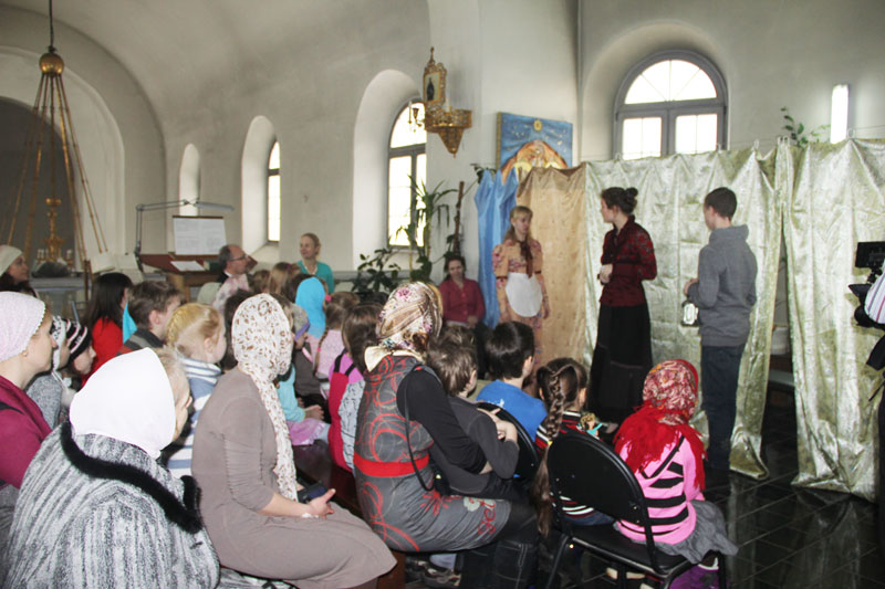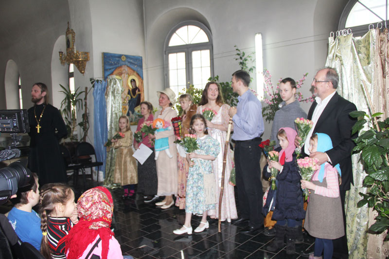 На масленицу, 16 марта 2013 г. театральная студия при воскресной школе, которой руководит Митюшина Т.Г., выступала со спектаклем по мотивам книги Элионоры Портер “Поллианна” в приходе храма св. вмч. Димитрия Солунского на Благуше. Спектакль был поставлен для детей воскресной школы прихода этого храма и был принят очень тепло. Радушные хозяева вручили всем артистам цветы и подарки.