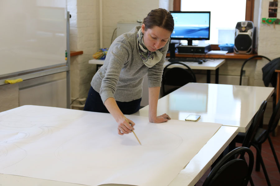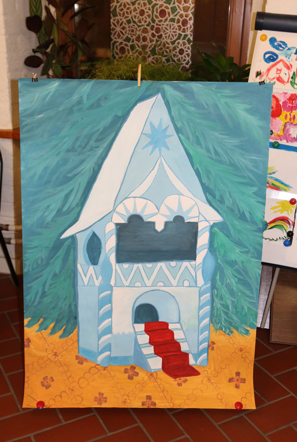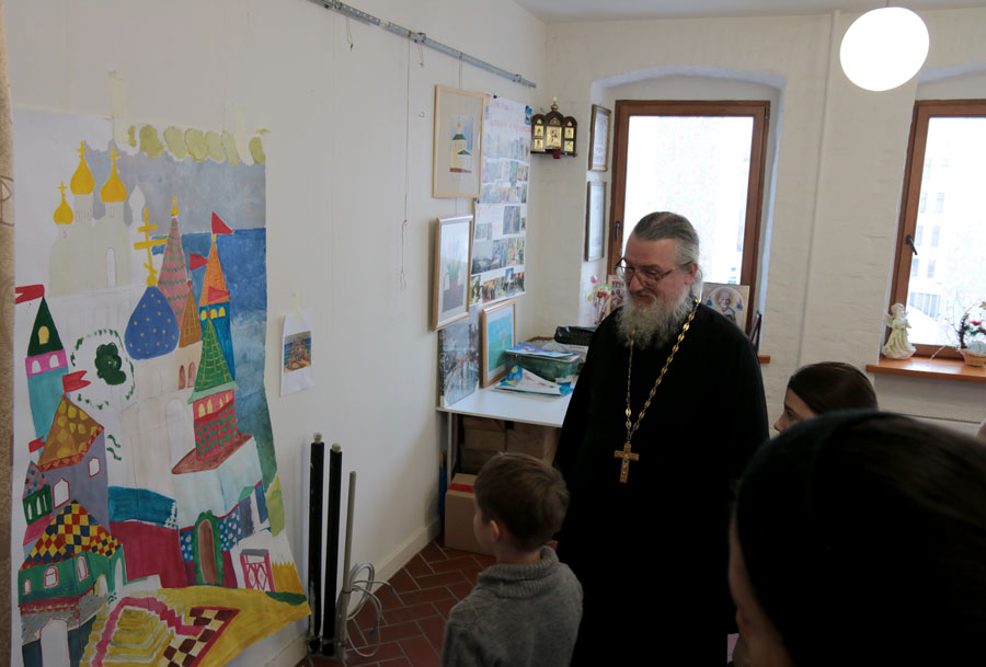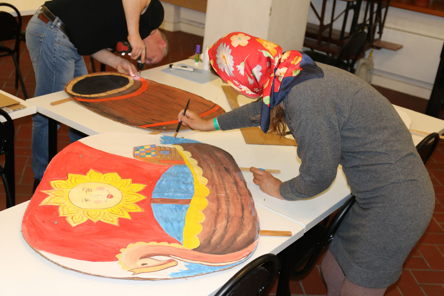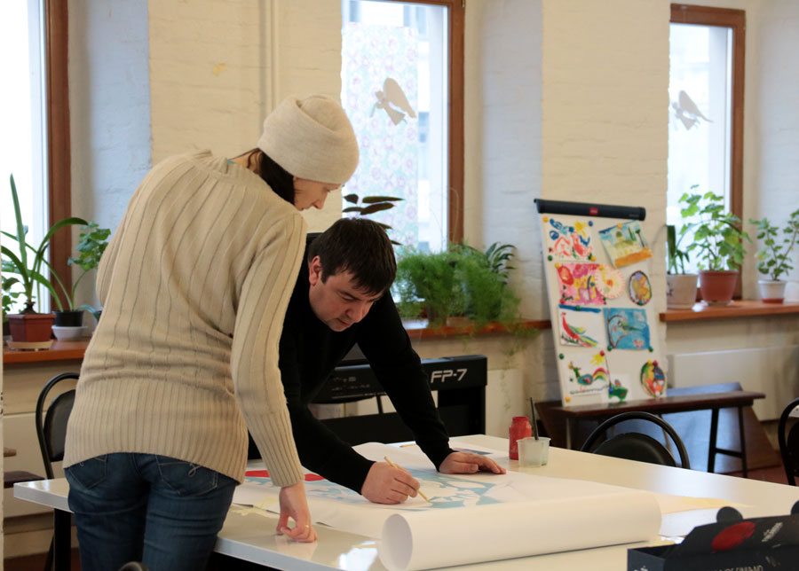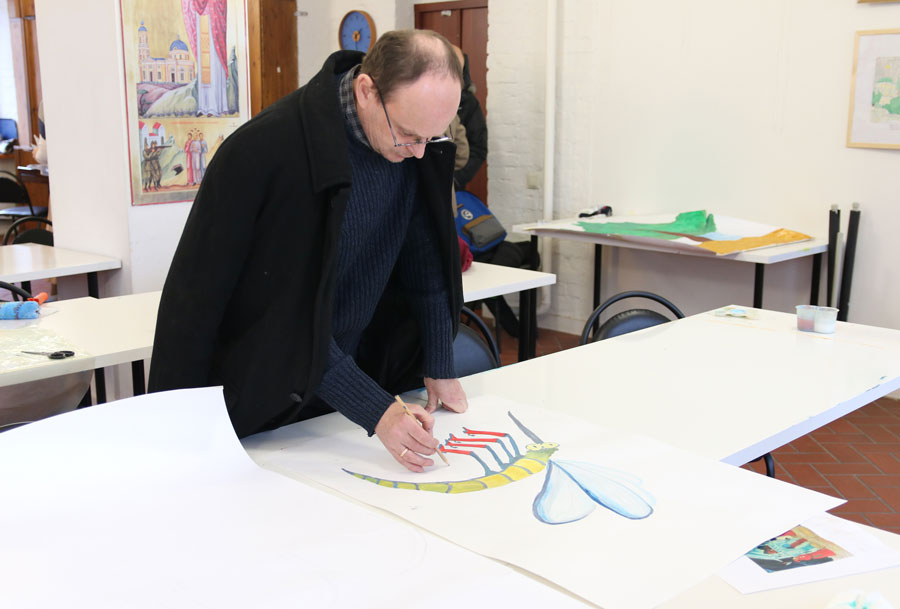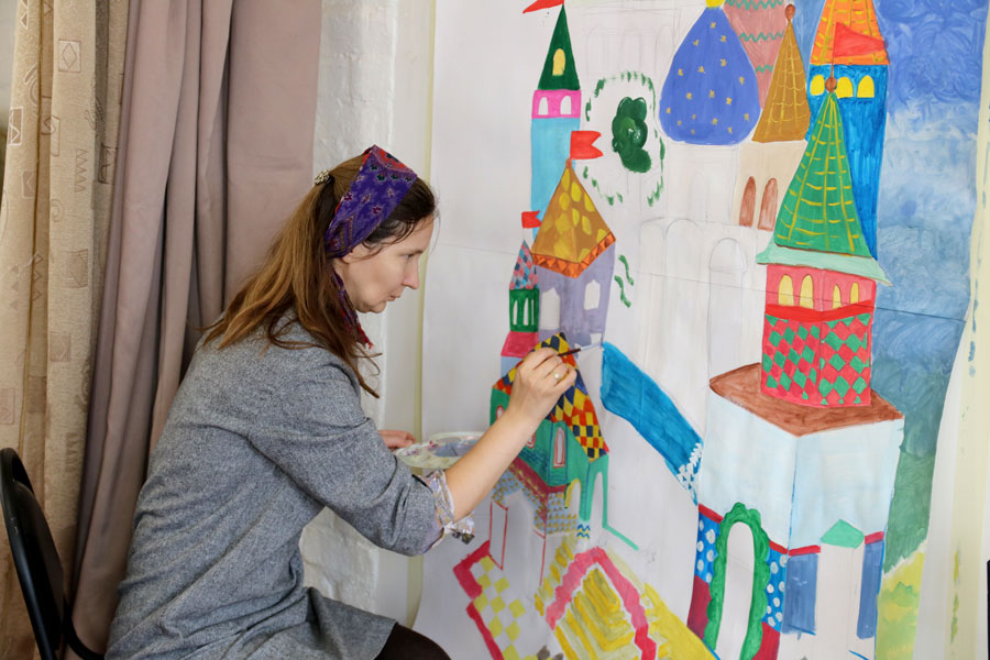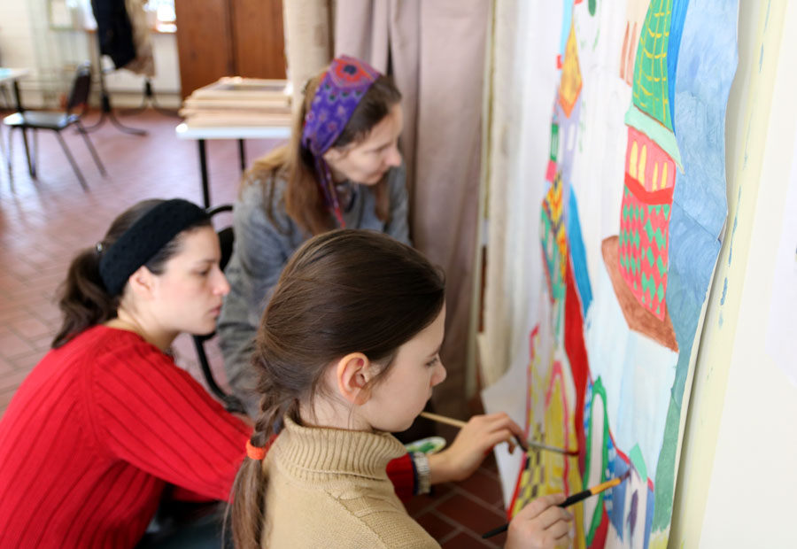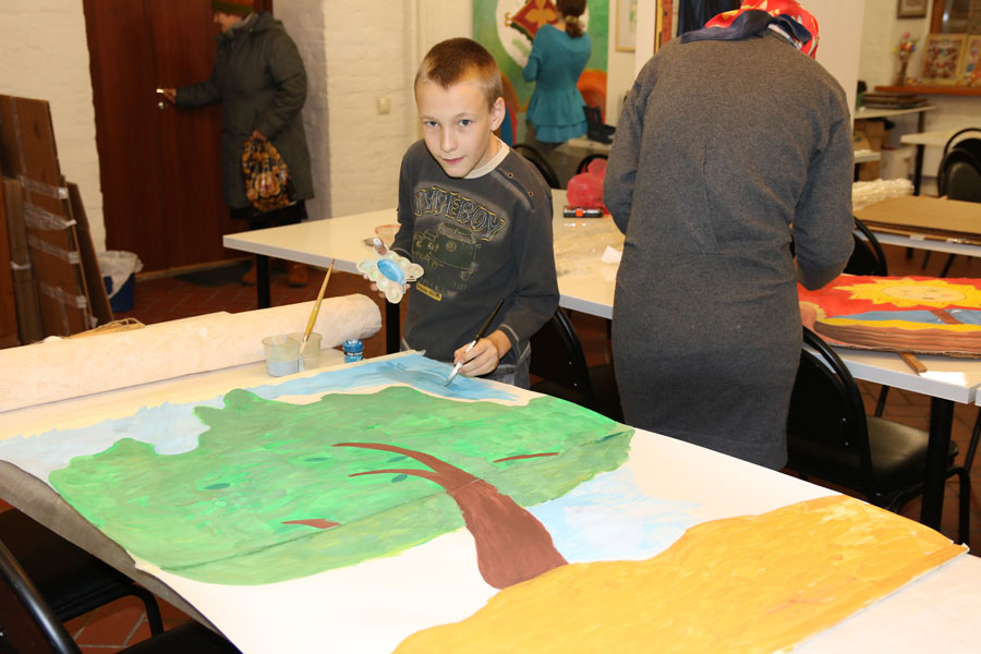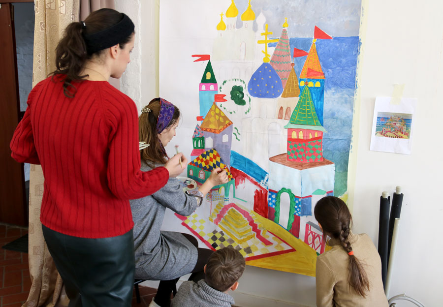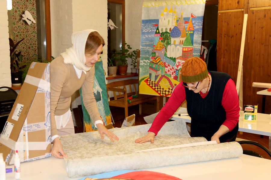 Преподаватели воскресной школы М. В. Судакова, Т. Н. Семенова, М. И. Литвиненко, Е. В. Журбина, приходская молодежь и учащиеся дети и их родители рисуют декорации для детского спектакля.