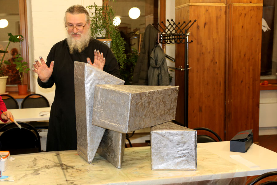 Кубики для интеллектуальных заданий для детей вырезают из картона, оборачивают обоями и красят серебряной краской преподаватели протоиерей Николай Скурат, Т. В. Качала, А. Г. Синельщиков и другие учащиеся взрослой воскресной школы.