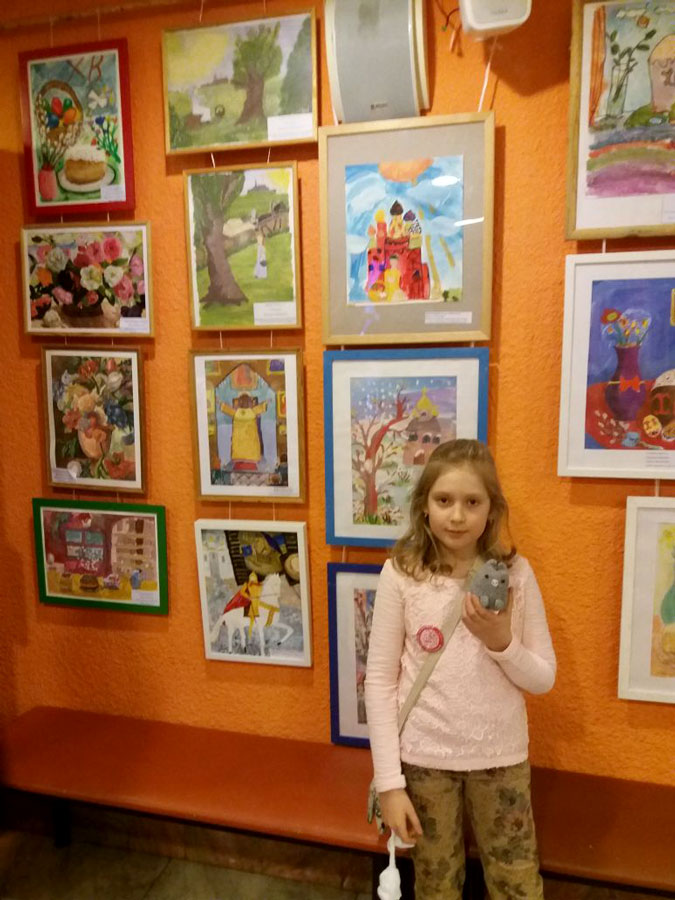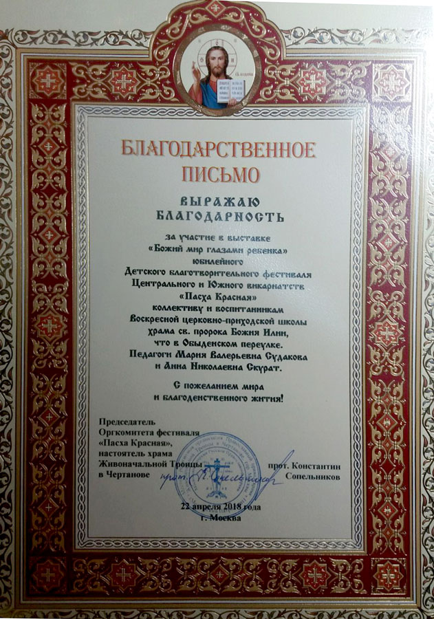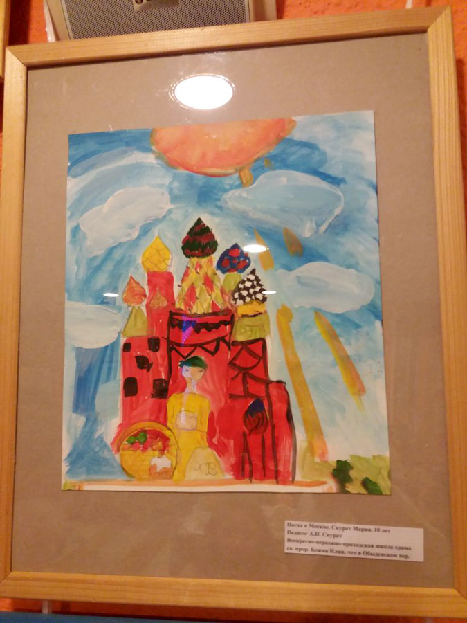 Наша воскресная школа отправила на выставку «Божий мир глазами ребенка» 10 детских рисунков, которые были выполнены под руководством педагогов Марии Судаковой и Анны Скурат на художественном мастер-классе и отобраны руководством школы для показа. Деятельность воскресной школы храма пророка Божия Илии в Обыденском переулке была отмечена благодарственным письмом оргкомитета Пасхального фестиваля.