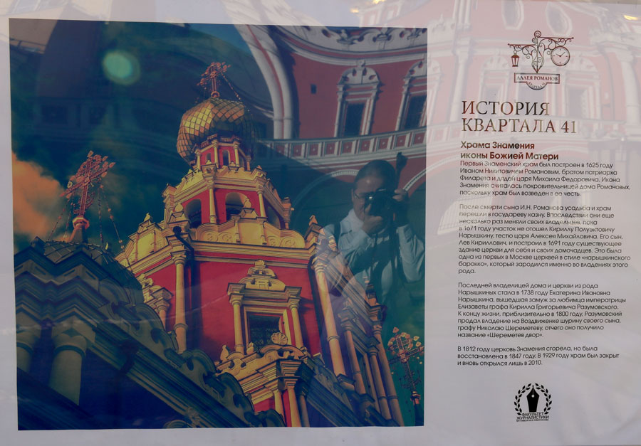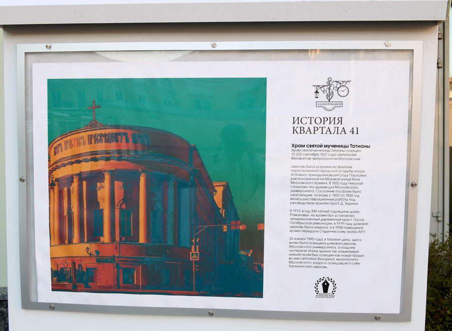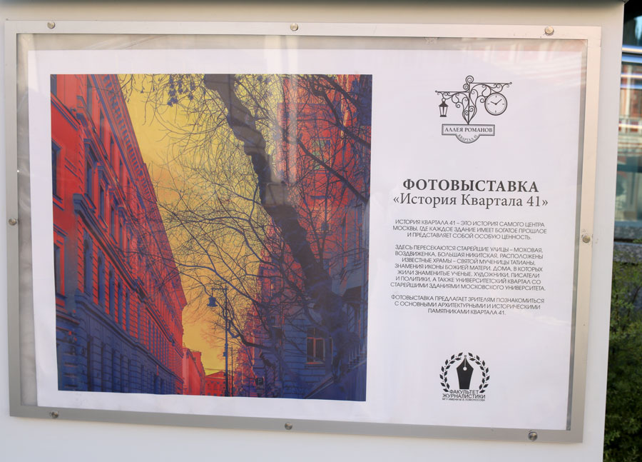 Фотовыставка «История Квартала 41» предлагает зрителям познакомиться с основными архитектурными и историческими памятниками квартала 41. Здесь пересекаются старейшие улицы — Моховая, Воздвиженка, Большая Никитская, расположены храмы святой мученицы Татианы и «Знамения» иконы Божией Матери, дома, в которых жили знаменитые ученые, художники, писатели и политики, а также университетский квартал со старейшими зданиями Московского университета.