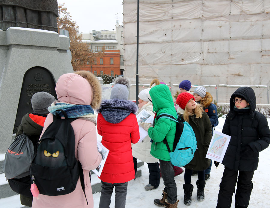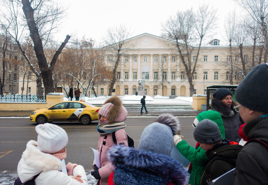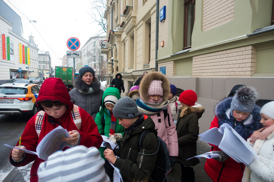 Ученики 4-х классов собрались у метро «Кропоткинская». Каждый участник путешествия получил карту и книжки с заданиями. Ребята должны были найти все объекты на маршруте и ответить на вопросы, связанные с историей улицы Остоженки, ее храмами и монастырями. Несмотря на холодную погоду, маршрут был пройден и задания выполнены.