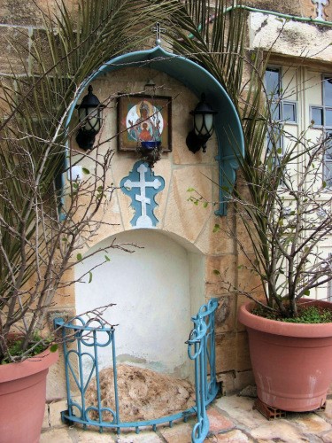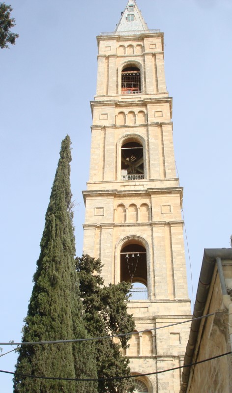 Стройную колокольню монастыря, несомненное его украшение, которую мы потом видели с любой точки в Иерусалиме, с любовью называют «Русскую свечой». Она является самым высоким сооружением в Святом граде. Колокол для нее был отлит в России и весит 5 тонн.