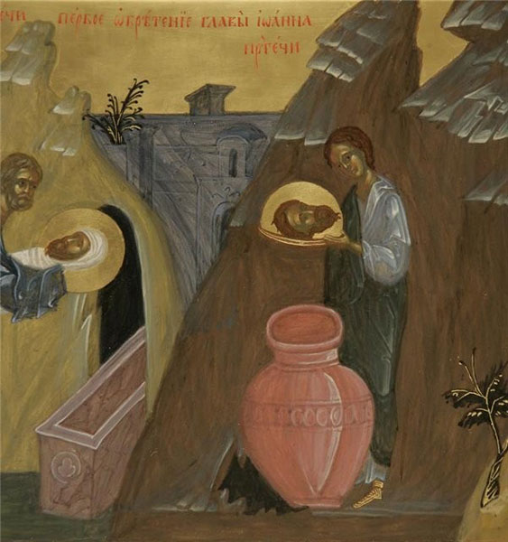 Иоанн Предтеча, великий праведник, крестивший Иисуса в водах Иордана, был обезглавлен по приказанию царя Ирода из-за козней иудейской царевны Иродиады и ее дочери Соломеи. Предание рассказывает о том, что после усекновения честной главы Иоанна Предтечи нечестивая Иродиада не позволила предать ее погребению вместе с телом святого, но, надругавшись над ней, закопала в своем дворце в «бесчестном месте». Тело же тайно забрали и погребли ученики святого. Благочестивой Иоанне, жене царского домоправителя Хузы (о ней упоминает святой евангелист Лука — Лк. 8, 3) было известно, где Иродиада закопала честную главу. И она тайно взяла святыню, положила ее в сосуд и погребла на горе Елеонской в одном из поместий Ирода.