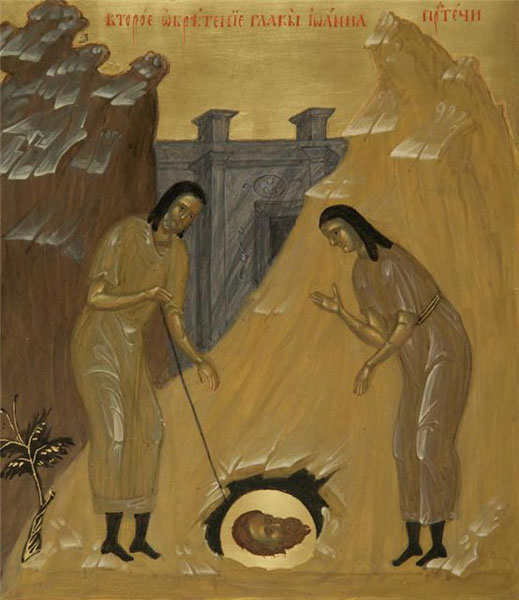 В дни равноапостольного царя Константина Великого (+337), когда христианская вера стала процветать, двум инокам, пришедшим в Иерусалим на поклонение святым местам, дважды явился сам святой Предтеча и открыл место нахождения своей честной главы. Иноки отрыли святыню и, положив ее в мешок из верблюжьей шерсти, пошли к себе домой. По дороге они встретили незнакомого горшечника и дали ему нести главу святого. Не зная, что у него в руках, горшечник спокойно продолжал путь. Но ему явился святой Предтеча и велел бежать от нерадивых и ленивых иноков вместе с драгоценной ношей…