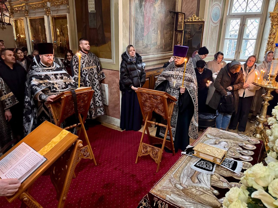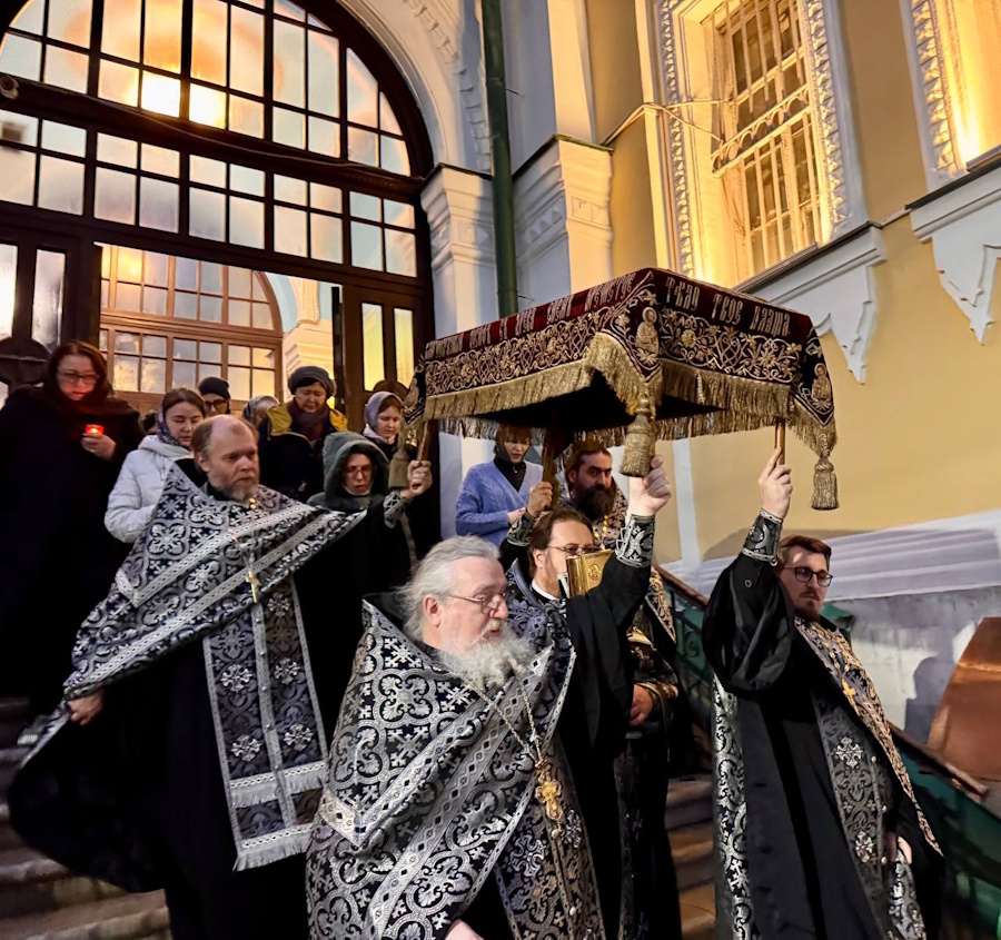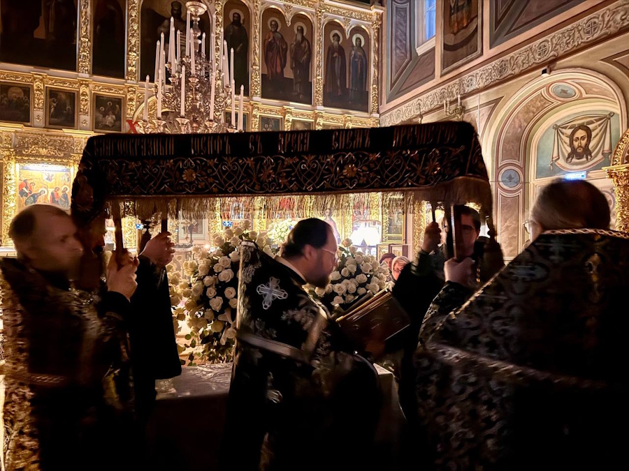 В четверг вечером совершалась утреня с чтением 12 Евангелий Святых Страстей. Утром в пятницу были прочитаны Царские часы, днем совершалась вечерня с выносом Плащаницы и чтением канона на плач Пресвятой Богородицы. Вечером утреней с чином погребения Спасителя начались богослужения Великой Субботы.